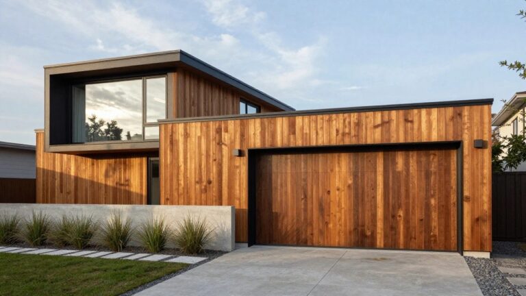 This setup suits homes with clean lines and neutral tones. Put it on a wide driveway where the door takes center stage. Seal the wood against weather. Skip busy details around it… simple grasses and wall lights work best.